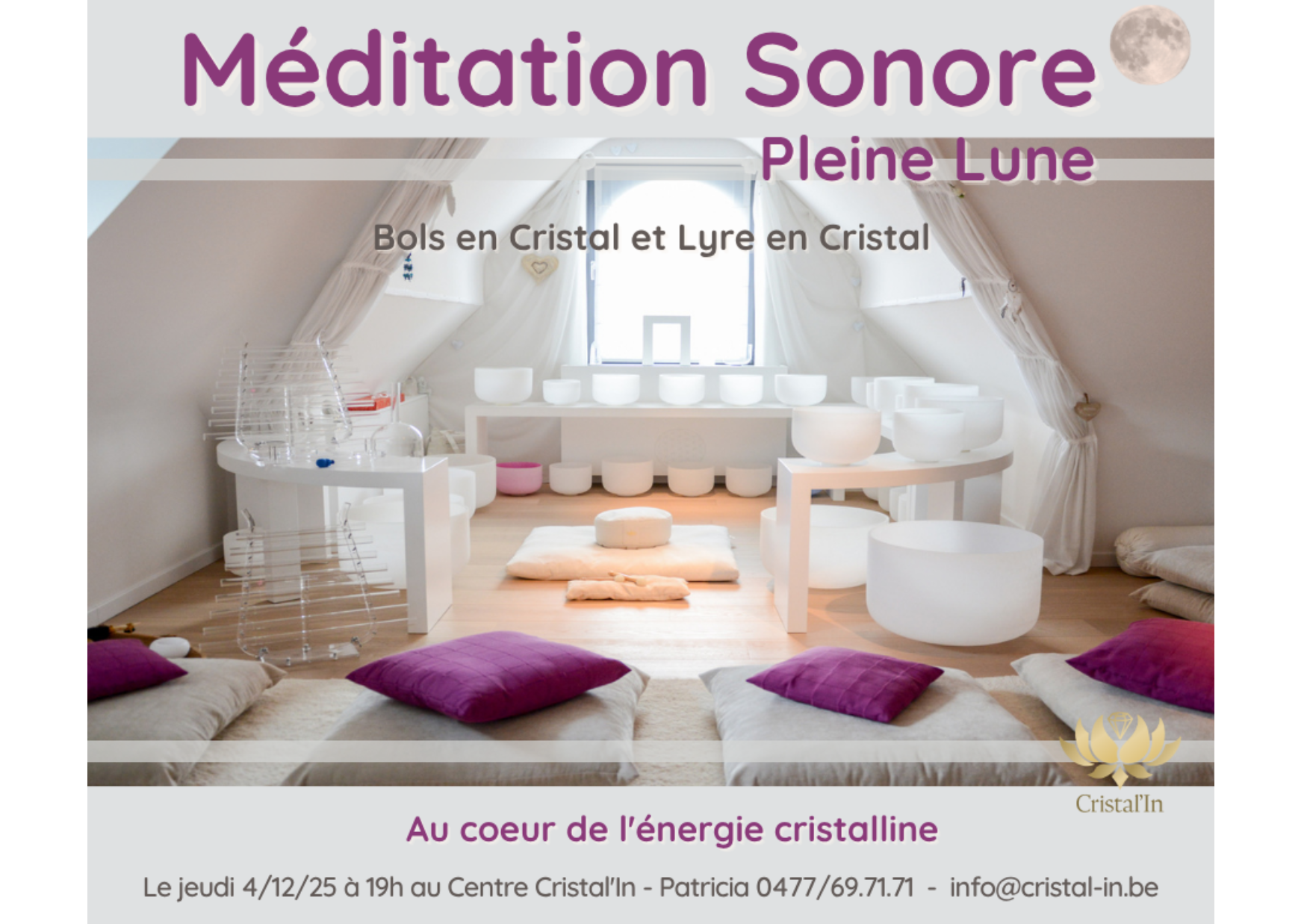 Sous la lumière magique de la Pleine Lune, plongez dans une méditation sonore qui éveillera chaque cellule de votre être. Laissez-vous envelopper par les vibrations lumineuses des bols et de la lyre en cristal. Durant une heure, les sons cristallins vous guideront dans un voyage intérieur profond, où chaque fréquence agira tel un baume régénérateur pour votre corps, votre âme et votre esprit. Cette Pleine Lune en Gémeaux ouvre un portail de clarté et d’alignement. Elle invite à libérer les dualités, à exprimer votre vérité et à reconnecter vos pensées à la sagesse du cœur. Accordez-vous ce moment sacré de purification et d’harmonisation globale pour rayonner dans votre pleine vibration. Ne manquez pas cette expérience unique au Centre Cristal’In : un rendez-vous avec vous-même, sous la guidance bienveillante de la Lune. "Laissez la lune vous éclairez, laissez le cristal vous transformer."