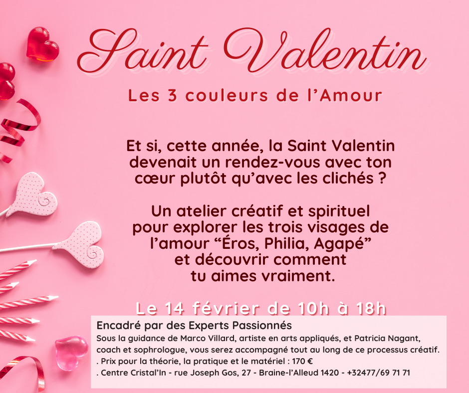 Et si tu découvrais les trois visages de l’amour ? Éros, Philia, Agapé : trois mouvements intérieurs, trois façons d’aimer, trois énergies qui cohabitent en chacun de nous. Éros : je désire, je prends, je dis oui à la vie. Philia : je partage, je donne et je reçois. Agapé : je rayonne, j’aime sans condition. En apprenant à les différencier, tu cesses de parler d’amour comme d’un seul bloc et tu ouvres ton cœur à une lucidité qui aligne ton désir, ton don et ta présence. Pour cette Saint‑Valentin, offre-toi une journée pour explorer ta façon d’aimer, au‑delà des codes et des attentes. Cet atelier mêle art‑thérapie, introspection et création consciente pour donner forme à ton propre panneau “Éros–Philia–Agapé”. Que tu sois en couple ou célibataire, tu es le ou la bienvenu·e pour venir danser avec les énergies de l’amour et découvrir ton mélange unique.