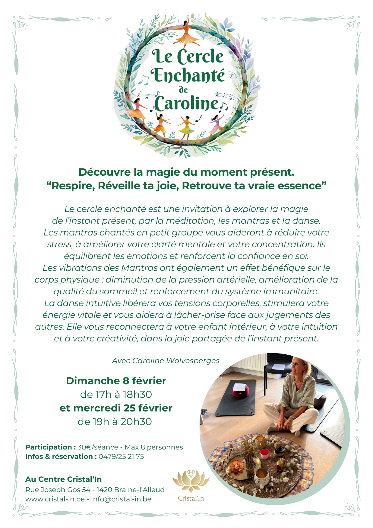 Le cercle enchanté est une invitation à explorer la magie de l’instant présent, par la méditation, les mantras et la danse. Les mantras chantés en petit groupe vous aideront à réduire votre stress, à améliorer votre clarté mentale et votre concentration. Ils équilibrent les émotions et renforcent la confiance en soi. Les vibrations des Mantras ont également un effet bénéfique sur le corps physique : diminution de la pression artérielle, amélioration de la qualité du sommeil et renforcement du système immunitaire. La danse intuitive libérera vos tensions corporelles, stimulera votre énergie vitale et vous aidera à lâcher-prise face aux jugements des autres. Elle vous reconnectera à votre enfant intérieur, à votre intuition et à votre créativité, dans la joie partagée de l’instant présent. Prochaine date : mercredi 25 février à 19h.