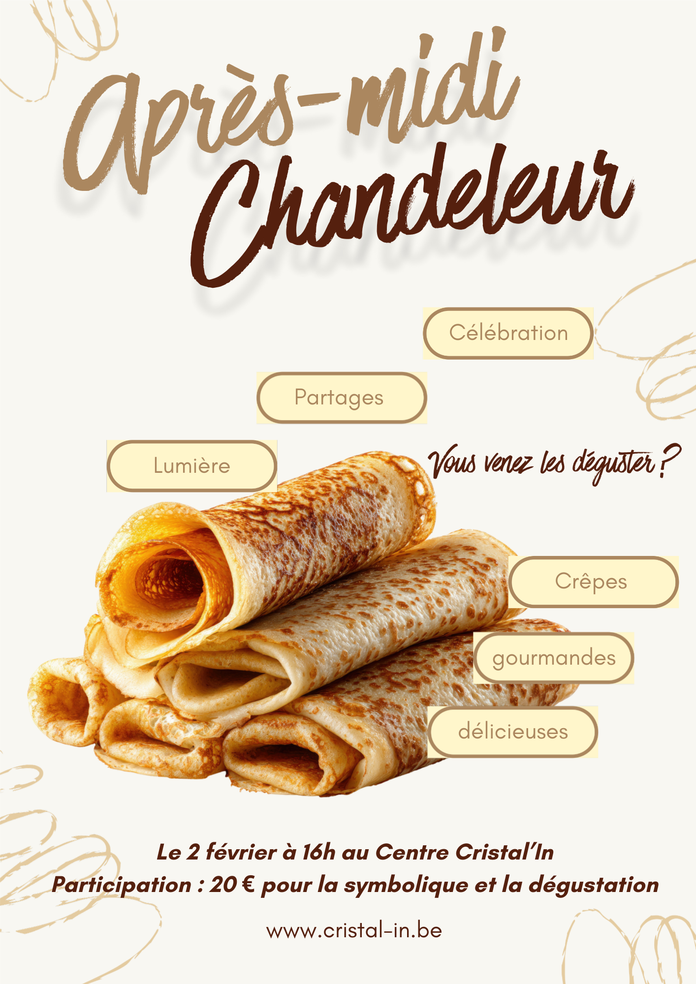Et si tu prenais un temps tout simple, tout doux, pour te reconnecter à la lumière… et te régaler de crêpes ? Je t’invite au Centre Cristal’In pour un moment convivial autour de : la symbolique de la Chandeleur : lumière, purification, renouveau, abondance. Un temps d’échange chaleureux, cœur à cœur. Un partage de délicieuses crêpes dans la simplicité et la bonne humeur. La Chandeleur, ce n’est pas seulement manger des crêpes, c’est aussi célébrer la lumière qui revient et ouvrir un nouveau cycle plus lumineux pour soi. Viens comme tu es, avec ton sourire, ton envie de partager… et peut-être une petite garniture à crêpes à déposer sur la table de l’abondance.