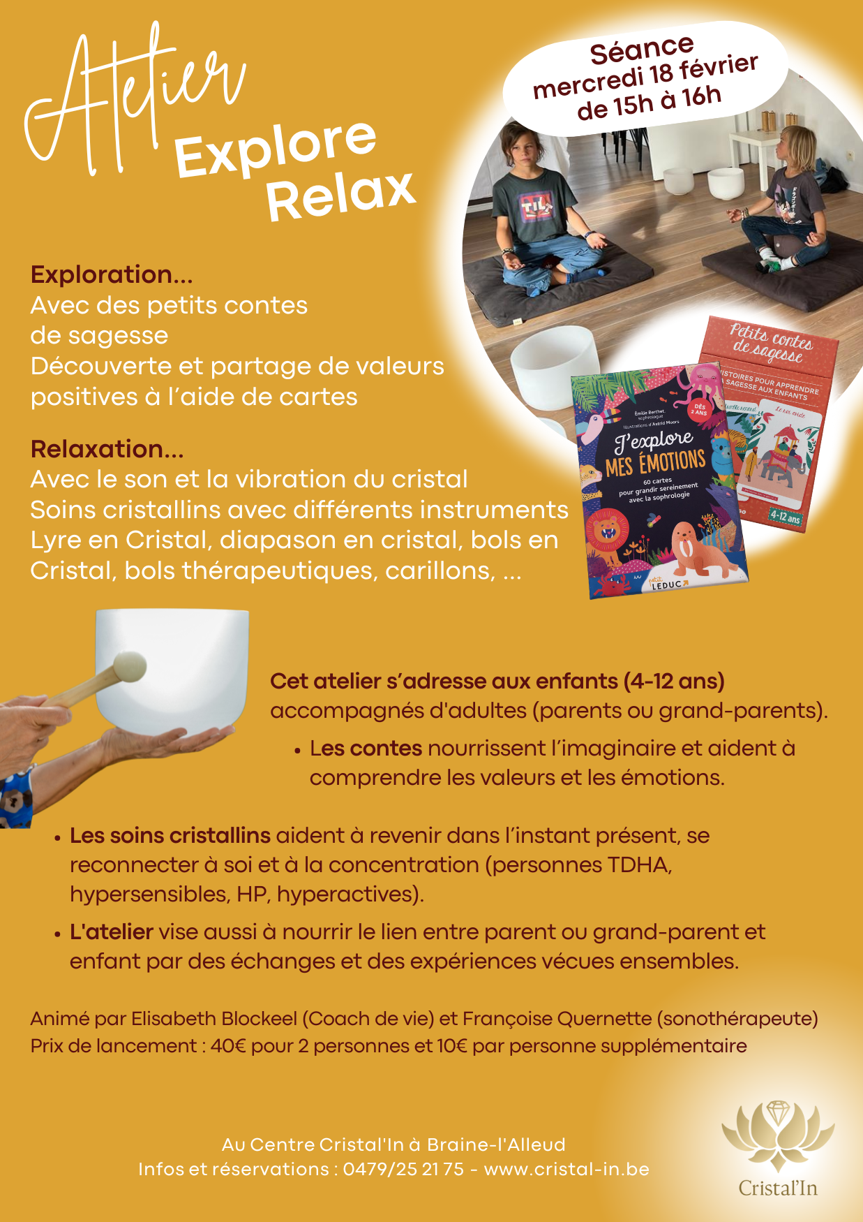Avec des petits contes de sagesse, découverte et partage de valeurs positives à l’aide de contes et de cartes. Ensuite la relaxation avec le son et la vibration du cristal, soins cristallins avec différents instruments : lyre en Cristal, diapason en cristal, bols en Cristal, bols thérapeutiques, carillons, … Les contes nourrissent l’imaginaire et aident à comprendre les valeurs et les émotions. Les soins cristallins aident à revenir dans l’instant présent, se reconnecter à soi et à la concentration (personnes TDHA, hypersensibles, HP, hyperactives). L'atelier vise aussi à nourrir le lien entre parent ou grand-parent et enfant par des échanges et des expériences vécues ensembles. Animé par Elisabeth Blockeel (Coach de vie) et Françoise Quernette (sonothérapeute)